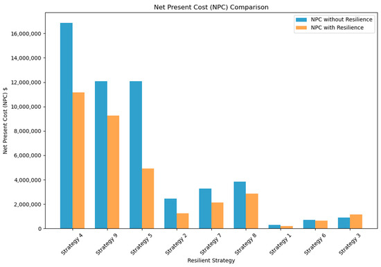 Figure 4 compares the NPC with and without selecting the resilient strategy over the lifetime of the resilient strategy. The difference in the bars represents the expected NPC of the expected savings that the resilient strategy would provide.