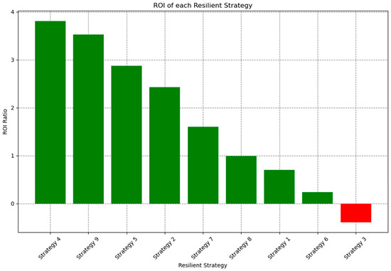 Figure 5 displays the ROI of each resilient strategy. Strategy 3 has a negative ROI, representing a loss on investment. Meanwhile, Strategy 4 has a ROI of 3.8, which represents a very large return on investment of 380%.