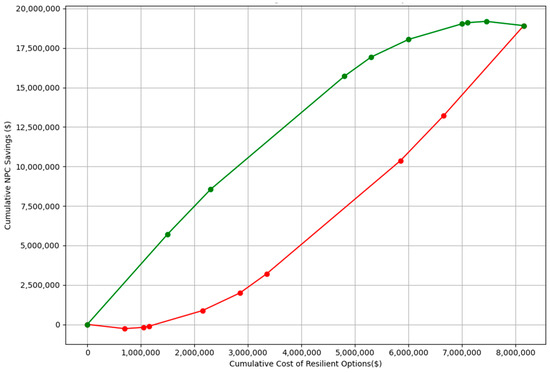 Figure 6 compares the cumulative expected NPC of funding multiple resilient strategies with the cumulative expected NPC savings. The top line in green represents the efficient frontier and the bottom line in red represents the inefficient frontier. Any portfolio of strategies funded would fall in the “football” region created by these two lines.