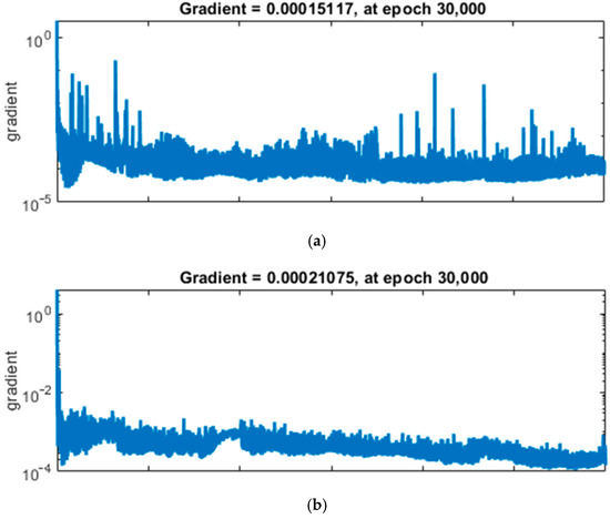 Convergence of ANN training gradients for (a) “freight cost” and (b) “delivery time” models over 30,000 epochs, displaying the final gradients at the conclusion of training.
