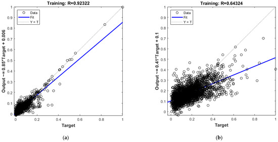 Performance of ANN models during training, represented by regression plots comparing predicted outputs versus targets for (a) “freight cost” model with a high correlation (R = 0.92) and (b) “delivery time” model with a moderate correlation (R = 0.64).