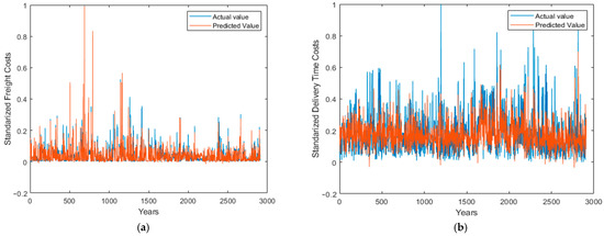 Overlay of actual and predicted values for (a) standardized “freight cost” and (b) standardized “delivery time” across almost 3000 observations, showcasing the predictive accuracy of the ANN models.