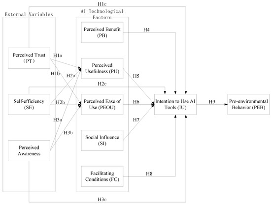The Unified Theory of Acceptance and Use of Technology (UTAUT) was formulated by synthesizing eight theoretical acceptance models, including the Technology Acceptance Model (TAM) [14]. UTAUT posits that four key constructs—performance expectancy, social influence, effort expectancy, and facilitating conditions—predict behavioral intentions, subsequently influencing user behavior. These constructs have demonstrated robust predictive power, explaining over 60% of the variance in behavioral intentions across different cultural contexts [14]. Notably, performance expectancy and effort expectancy closely align with TAM’s perceived usefulness (PU) and perceived ease of use (PEOU) constructs, respectively. Given this overlap, the present study focuses on PU and PEOU as primary predictors of intention to use environmental AI products, alongside additional relevant factors. Consequently, performance expectancy and effort expectancy are excluded to avoid redundancy and maintain conceptual clarity.