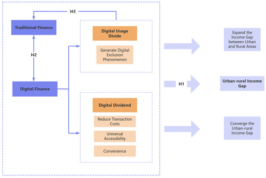 Financial system development is a key factor in the income gap, with traditional finance contributing to uneven growth [6]. On the one hand, the inherent “preference for the affluent” in traditional finance has restricted long-tail populations from accessing financial services effectively, exacerbating income disparities [7]. On the other hand, the reliance on conventional financial systems has further entrenched China’s dual-tiered financial structure, ultimately leading to a skewed allocation of financial resources [8]. Urban centers tend to secure a larger portion of available resources, whereas rural and less developed regions often grapple with high transaction costs, restricted financial access, and exclusion from mainstream financial services [9]. This imbalance hinders rural development and widens the urban–rural income gap. However, digital finance, enabled by information technology, overcomes the spatial limitations of traditional finance [10]. Leveraging the internet and modern technology, digital finance enhances access to financial services, reduces information asymmetry, and mitigates financial exclusion [11]. This has enabled underserved populations to access financial resources, stimulated rural economies, and addressed the dual economic structure, offering opportunities to narrow the urban–rural income gap [12]. Promoting digital finance can drive economic growth, reduce poverty, and strengthen the structure, supporting sustainable development [13].