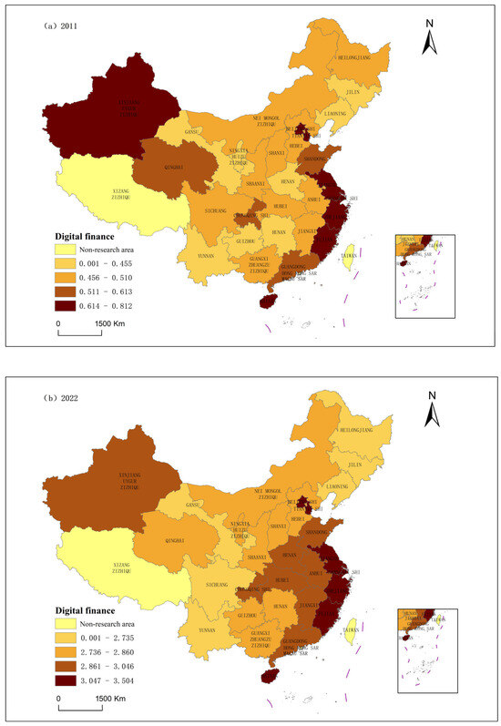 The description of the level of digital finance in China for 2011 and 2022 is shown in Figure 2. The legend represents the average digital finance level of each province, calculated based on selected cities and mapped using ArcGIS software (version 10.8). As only Urumqi, the capital city, was selected for Xinjiang, and Xining for Qinghai, these two provinces lack horizontal comparability. Apart from these two provinces, data from 2011 show that digital finance was more developed in the eastern coastal regions than in inland areas. This trend is largely driven by the rapid advancement and widespread adoption of information technology in coastal regions. However, overall, the level of development was still low, with indices ranging from 0.614 to 0.812.