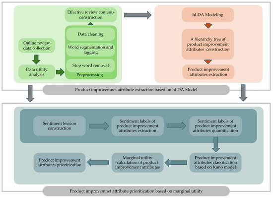 In the first part, online review data, including review time, review score, review content, user credit rating, and number of likes, are collected from an e-commercial platform. A utility analysis is then conducted using user credit ratings, number of likes, and review time to filter out low-utility review content. Based on this, preprocessing is performed on the review contents, including data cleaning, word segmentation, tagging, and stop word removal, to obtain the effective review content, which is used as the input of the hLDA model. Finally, a hierarchical tree of product improvement attributes is generated, and the lowest-level attributes in the hierarchical tree are considered as product attributes that should be improved.