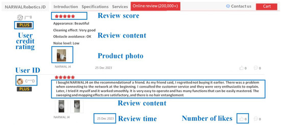 Chatterjee [26] first defined the term “online reviews”, describing them as public evaluations of products, services, or businesses posted on e-commercial platforms. These reviews aim to communicate both positive and negative experiences to a wide audience. Typically, online reviews combine text, images, videos, and ratings, and they have become prevalent across e-commercial platforms, including Taobao, JD, Amazon, and TripAdvisor [27]. Online reviews help users to assess products and services while making purchase decisions, enhance trust and credibility between buyers and sellers, and aid prospective customers in their decision-making process [21].
