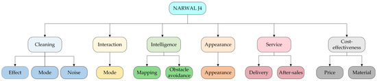 First, the number of review contents of each topic is compared with those of other topics at the same level from the bottom to the top, and the topics with fewer review contents are deleted to identify the topics that are most in line with user concerns. Second, the PMI algorithm [73], which evaluates the correlation between words, is iteratively applied to calculate the correlations of words in each topic, and words with a high correlation in each topic can be selected. Manual adjustments might be carried out in this step, to remove or combine certain words. Then, these selected words can be used to derive topics into product improvement attributes. Words referring to a specific characteristic, feature, or property of a product can be extracted directly as attributes. As for words that cannot be used directly as product improvement attributes, designers should consider them carefully and try to further classify them into certain product improvement attributes according to the user emotions or usage scenarios expressed by the words. Through this process, an initial hierarchical tree of the product improvement attributes can be constructed.