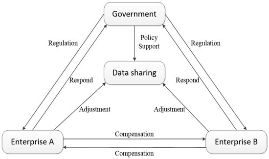 The process of enterprise data sharing under government regulation mainly includes three subjects: the government, Enterprise A, and Enterprise B. In the whole system, the government leads data legislation, legislates for data sharing, and is responsible for the implementation of relevant policies. Meanwhile, the government is also the direct beneficiary of policy implementation, which prompts it to take a more proactive stance in data element governance. Enterprise A and Enterprise B are mainly engaged in the collection, processing, and utilization of data for value creation, and decide whether to share data. Without considering other external factors, it is assumed that the government, Enterprise A, and Enterprise B are the three parties involved in enterprise data sharing. All three parties are bounded rationality, and there is information asymmetry among them. Each party’s behavior strategy will be influenced by the behavior strategies of the other two parties.