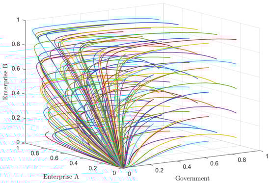 By associating the replicator dynamic equation F(p1), F(p2), and F(p3), the three-dimensional dynamic evolution system between the government, Enterprise A, and Enterprise B can be obtained in the process of enterprise data sharing under government regulation, as shown in Equation (13).