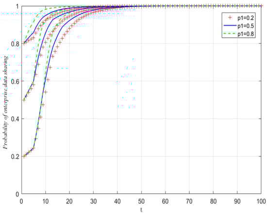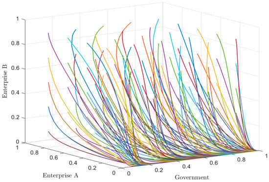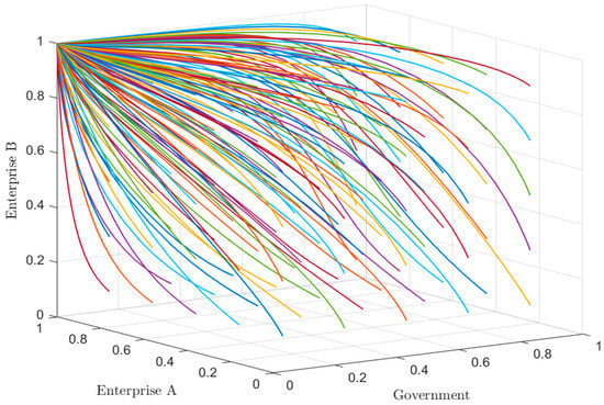 According to the previous assumption that Enterprise A and Enterprise B are completely symmetrical, this paper assigns the same initial probability to both Enterprise A and Enterprise B’s behavior strategies to analyze the impact of different enterprises’ initial willingness on the evolution trajectory of government behavior strategies. Simultaneously, this paper delves into the evolutionary trajectories of enterprises’ behavioral strategies under varying initial inclinations within the initial assessment of the government’s behavioral strategy. The results are shown in Figure 6 and Figure 7. Figure 6 shows the evolution trajectory of government behavioral strategies under different initial willingness of enterprises. It can be discerned that the initial willingness level of local enterprises’ “data-sharing” strategy will not change the evolution direction of the government’s “no regulation” behavioral strategy, but it will exert an impact on the evolution rate of the government’s behavioral strategy. Specifically, when enterprises exhibit a greater inclination towards “data-sharing”, the government’s “no-regulation” behavioral strategy becomes more pronounced, and the time required for its evolution is shorter. The rationale lies in the fact that the objective of government regulation is to achieve enterprises’ data-sharing. Thus, when enterprises demonstrate a strong inclination to share data, the government can promptly curtail the expenditure associated with its regulatory behavioral strategy. This enables the government to expedite the self-adjustment process within the data-element market.