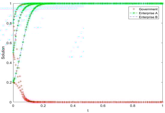 To intuitively analyze the relationships among the government, Enterprise A, and Enterprise B in the above model and the impact of relevant parameters on the game equilibrium. This part will assign values to parameters and conduct simulation analysis using Matlab 2016a software. First of all, the parameters are assigned for the above three stable scenarios, as follows: