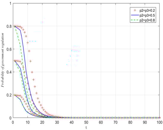 To investigate the impact of the initial inclinations of the government, Enterprise A, and Enterprise B in their choice of behavioral strategies on the evolution results, this paper sets the probabilities combination of the initial willingness (p1, p2, p3) as (0.2, 0.2, 0.2), (0.5, 0.5, 0.5), (0.8, 0.8, 0.8), respectively. Here, p1 represents the probability that the government opts for regulation, p2 refers to the probability that Enterprise A chooses “data-sharing”, p3 is the probability of Enterprise B choosing “data-sharing”. The values of the remaining parameters are as described in the previous section. The behavioral strategies and evolutionary trends of the three parties under different initial conditions are shown in Figure 5. It can be observed that, under the above-mentioned parameter settings and initial probability conditions, the government’s behavioral strategy gravitates towards “no regulation”, while the behavioral strategies of Enterprise A and Enterprise B tend towards “data-sharing”.