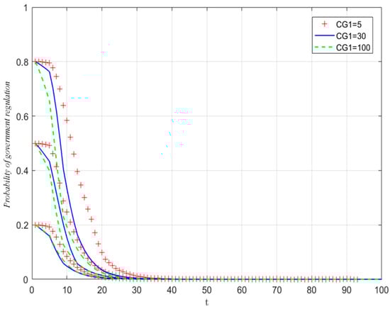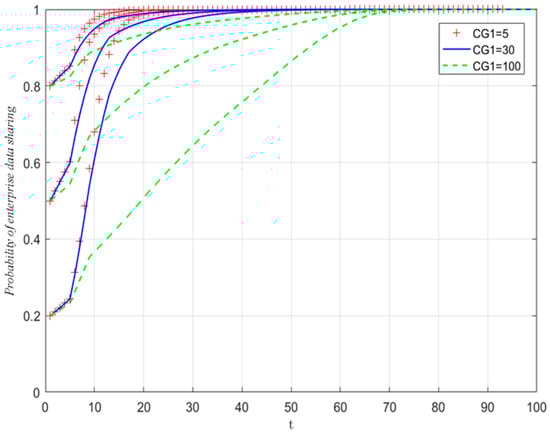 It can be observed that regardless of the different regulation costs, the government’s behavioral strategies tend to lean towards “no regulation”, while the enterprises’ behavioral strategies tend to be “data-sharing”. Under varying initial willingness levels, the increase of CG1 will accelerate the evolution speed of the government’s “no-regulation” strategy and curtail the time of the government’s evolution to the ESS. For enterprises, as CG1 increases, the pace of their “data-sharing” activities gradually decelerates, which will increase the evolution time of the enterprise’s behavior strategy to ESS. The lower the initial propensity of enterprises to adopt the “data-sharing” strategy, the more pronounced the impact of the augmented government regulation cost on the speed at which they evolve toward ESS. Under these circumstances, the government can appropriately cut down on the regulation cost. This not only helps in reducing fiscal expenditure but also quickens the process through which enterprises achieve data sharing.