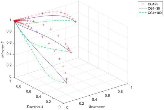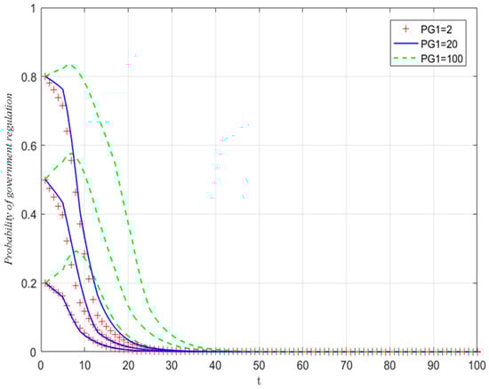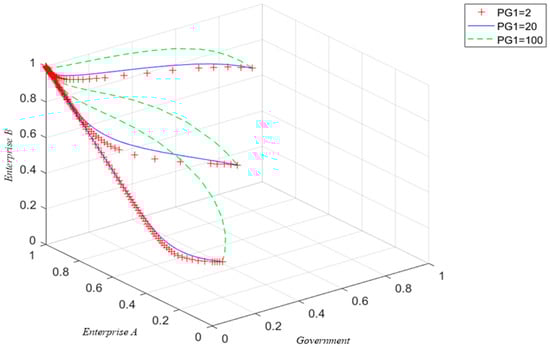 With other parameters remaining unchanged, the value of PG1, which refers to the government’s penalty for enterprises’ “no-data-sharing” under its “regulation”, is set to 2, 20, and 100, respectively, for simulation analysis. Figure 11 and Figure 12 illustrate the impact of the government’s penalty on enterprises’ “no-data-sharing” behavioral strategies of the government and enterprises, and Figure 13 demonstrates how the government’s penalty on enterprises influences the behavioral strategies evolution of the three parties from a three-dimensional perspective.
