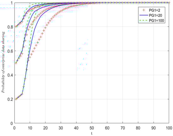 It shows that government penalties PG1 do not change the final trend of the three subjects’ behavioral strategies. An increase in PG1 will slow down the evolution of the government’s “no regulation” strategy but will accelerate the evolution of enterprise A and Enterprise B to the “data sharing” strategy. For the government, there is no significant difference between the evolution paths with PG1 values of 2 and 20, indicating that an increase in PG1 within a certain range will not have a significant impact on the government behavior strategy. When the value of PG1 is 100, the governmental behavioral strategy initially exhibits a tendency towards “regulation” and then shifts to “no-regulation”, indicating that when PG1 exceeds a certain range, it will prompt the government to consider adopting the “regulation” strategy and slow down the pace of the “no-regulation” strategy. Consequently, this significantly increases the evolution time of the government behavior strategy to ESS. For enterprises, when the initial willingness of “data-sharing” is relatively high, the effect of increasing PG1 on enterprise behavioral strategy is not significant, while the initial willingness level of enterprise “data-sharing” is low, the increase of PG1 will accelerate the evolution of enterprise to ESS. Therefore, the government can moderately increase administrative penalties in order to better promote enterprises to achieve data sharing.