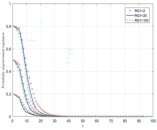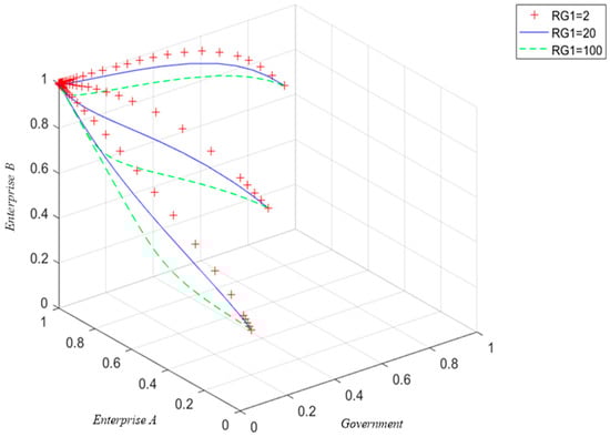 Other parameters remain unchanged, and the government’s rewards to enterprises for “data-sharing” under its “regulation”, denoted as RG1, are respectively assigned to 2, 20, and 100 for simulation analysis. Through this, we can obtain the impact of the government’s reward for enterprises’ positive responses to data-sharing regulation on both the government and enterprises’ behavioral strategies, and the results are shown in Figure 14, Figure 15 and Figure 16. Figure 14 and Figure 15 show the impact of RG1 on the behavioral strategies of the government and enterprises, and Figure 16 shows how the government’s rewards for enterprises affect the evolutionary trajectories of the behavioral strategies of the three parties from a three-dimensional perspective.