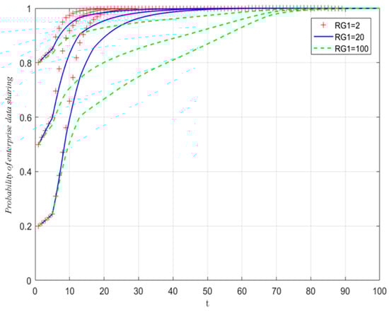 It can be seen that RG1 does not affect the final evolution trajectory of the government, Enterprise A, and Enterprise B. RG1 does not exert a significant impact on the evolution direction and speed towards the ESS, but the increase of RG1 will slow down the evolution speed of Enterprise A and Enterprise B to the ESS. For enterprises, the higher RG1 is, the slower the evolution to ESS is at different initial willingness levels, and when RG1 exceeds a certain value, it will greatly lengthen the evolution time to ESS. The reason is that the government’s incentive mechanism will not impose substantial losses on the government, while high-level incentives can effectively mitigate the costs and losses of enterprise data sharing, which makes enterprises more likely to choose the “data-sharing” strategy. Concurrently, as the enterprises’ willingness to share data grows, the government will tend to choose the “no-regulation” strategy. However, when the government’s reward for enterprise data sharing is high, enterprises will choose to slow down the pace of data sharing in order to enjoy the rewards for a longer time. Therefore, the government ought to moderately scale back the level of incentives provided to enterprises for data sharing. This approach will enable enterprises to engage in data sharing at a more rapid pace.