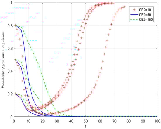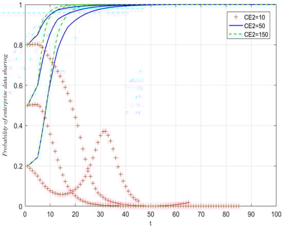 It can be observed that the CE2 will have a greater impact on the final behavioral strategy evolution trajectory of the government, Enterprise A, and Enterprise B. When CE2 is at a relatively low level, the government’s behavioral strategy will ultimately converge towards “regulation”, and the enterprises’ behavioral strategy will eventually shift towards “no-data-sharing”. When the CE2 level rises to a certain critical value, the government and enterprises’ behavioral strategies will evolve to “no regulation” and “data-sharing”, respectively. From the government’s perspective, when the CE2 level is low, enterprises will tend to hoard data, in this case, the government has to step in with regulations to compel enterprises to share data. As the CE2 increases to a certain range, enterprises will actively choose the “data-sharing” strategy, and then the government can achieve the effect of macro-control without adopting strict monitoring measures. From the enterprises’ standpoint, when the CE2 is at a low level, the revenue derived from sharing data is low, while the compensation fees for sharing data remain high. As a result, enterprises will tend to adopt the “no-data-sharing” strategy. As CE2 increases, and when the compensation from data sharing can make up for the cost, enterprises will prefer data sharing. The higher the compensation, the faster the evolution of enterprises toward “data-sharing”. This approach can effectively promote mutual benefit and a win–win situation for all enterprises involved.