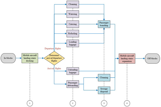 Efficient airport operations rely heavily on the support of ground-handling vehicles, which play a crucial role in ensuring flight safety, enhancing operational efficiency, and meeting passenger demands. Based on practical research at airports, the primary process of ground support services can be summarised as illustrated in Figure 1. As awareness of environmental issues and sustainability grows, many airports are transitioning to electric ground-handling vehicles. However, this shift introduces significant challenges in scheduling, as the scheduling of electric vehicles has not been extensively researched, and traditional models fail to address the complexities of modern airport operations. Consequently, optimizing the scheduling of electric ground-handling vehicles has become a critical concern for airport management.
