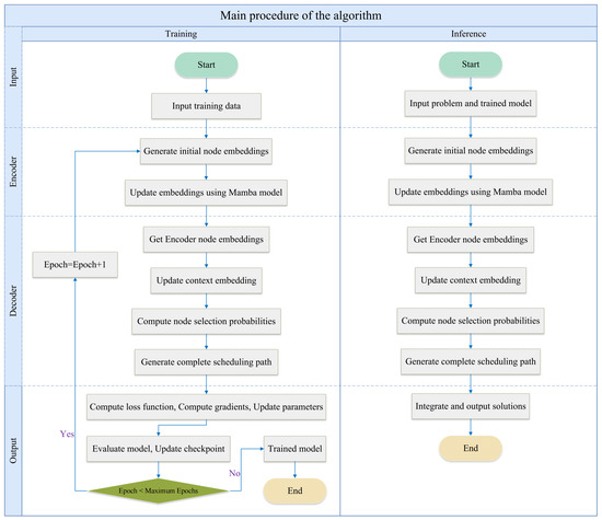 Additionally, an attention-based neural network, functioning as a decoder, is designed to dynamically select the most suitable flights for electric ground-handling vehicles to service. By leveraging reinforcement learning, the decoder continuously improves decision-making efficiency, reducing reliance on manually designed heuristics and enabling better generalization across different scheduling scenarios. The decoder’s parameters are optimized through reinforcement learning to generate efficient scheduling solutions. The training and solving processes of the algorithm are illustrated in Figure 4, demonstrating how the model learns to generate optimal scheduling solutions through the interaction between the Mamba model and the attention-based neural network.