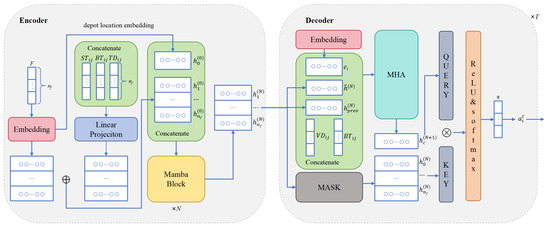 The encoder employs the Mamba model to comprehensively process multi-dimensional features of flights F and electric ground-handling vehicles V. Unlike traditional attention-based approaches, the Mamba model excels at capturing complex relationships between nodes through its state space modeling architecture [28]. This makes it particularly suitable for airport ground operations, where vehicles and flights interact with various spatial and temporal constraints. The encoding process consists of the following steps: