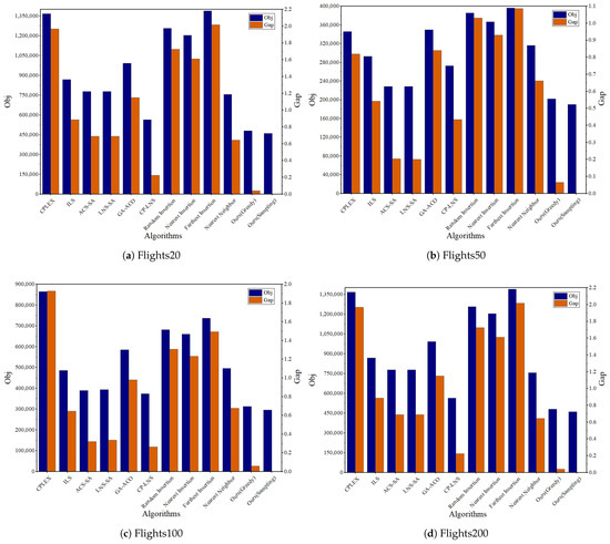 Comparison of Obj (total travel distance) and Gap (algorithmic performance deviation) among algorithms across flight numbers.