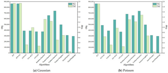The objective function values and gap results obtained by the algorithms are shown in Figure 8, and the computational times are shown in Figure 9. From Figure 8 and Figure 9, it is evident that our algorithm achieves the lowest objective value and gap in a shorter time. Further analysis of the data in Table 5 reveals that, in the Gaussian distribution case, the CP-LNS algorithm generates the shortest total distance among the other comparison algorithms. Compared to CP-LNS, the sampling strategy in this study reduces the cost by 27.49%, while the greedy strategy reduces the cost by 20.41%.