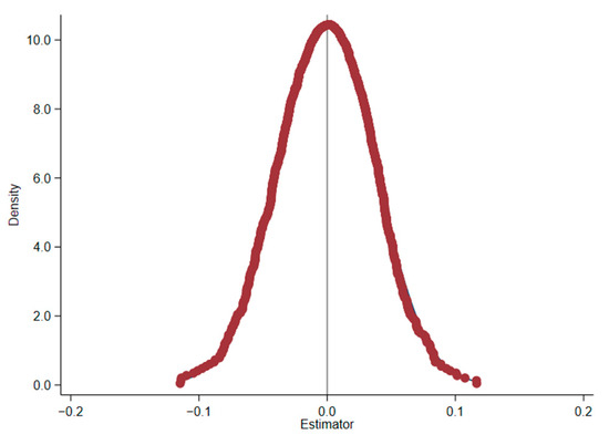 Finally, we conduct a placebo test to exclude any possible interference in cross-listing effects due to omitted variables [102]. Specifically, 1206 firms are randomly selected from the initial sample, and the rest are used as the control group. We repeat this random sampling and regress Equation (2) 1000 times. Figure 2 shows the probability density distribution of coefficients obtained from 1000 regressions. The 1000 estimated results are far smaller than the actual estimated coefficients of crossah (0.391), indicating that the result of baseline regression is less likely to be disturbed by unobservable variables.