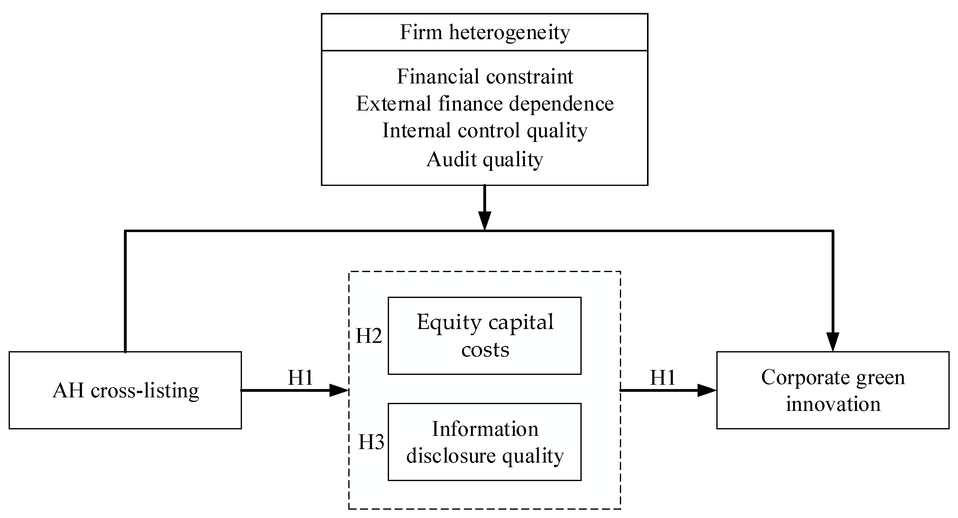 This study aims to fill the above research gap by specifically investigating the impact of cross-listing on corporate green innovation. We chose AH cross-listed firms as the research objects from the perspective of cross-listing between the Chinese mainland and the Hong Kong stock markets. Hong Kong and the Chinese mainland share the same cultural origins and are adjacent, differing only in their political and economic systems, laws, and regulations. The AH cross-listing sample is conducive to controlling for the influence of other differential factors between the two markets on corporate green innovation. As the largest developing country and the second largest economy, China’s economic model has a far-reaching impact on other countries. Therefore, the research based on AH firms has great practical implications for China and other developing countries in motivating corporate green innovation. Our empirical test, based on theoretical deduction, shows a significant positive effect of AH cross-listing on corporate green innovation. Further, we implement mediation analysis and verify that AH cross-listing spurs corporate green innovation by reducing equity capital costs and optimizing information disclosure quality. The results of heterogeneity analysis based on the differences in enterprises’ characteristics indicate that AH cross-listing’s positive effect on corporate green innovation is more significant in sample groups with high-level financing constraints, high dependence on external financing, high-quality internal control, and poor audit quality than their counterparts.