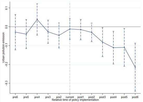 In the formula, D is a dummy variable, and t0 represents the year of policy implementation. It can be observed that β0 denotes the policy effect during smart city construction, while β−6 to β−1 represent the pre-treatment differences in pollution levels between the treatment group and control group, respectively, and β1 to β6 represent the post-policy implementation differences in pollution levels between these groups. It is worth noting that since the initiation of the first wave of smart city pilots in China in 2012, cities with partial treatment groups have not exhibited a sample value exceeding −6. To ensure avoidance of multicollinearity and facilitate accurate observation, the observation window for capturing the dynamic effects of parallel trends has been set for the period from −6 to +6.