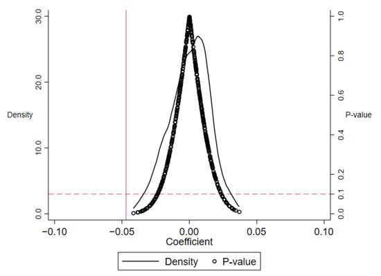 To eliminate the potential influence of unobservable confounding factors in the baseline regression, we conducted a placebo test using a random draw of the policy interaction term (Smart). The procedure involved randomly selecting the core explanatory variable Smart and re-estimating model (1), extracting the coefficient estimates and p-values. This process was repeated 1000 times, and a kernel density plot and a scatter plot of p-values were created, as shown in Figure 2. Figure 2 illustrates that the estimated coefficients of the randomly sampled Smart are centered around zero and approximately follow a normal distribution, with a significant difference from the coefficient estimate of −0.048 in the baseline model (1). Furthermore, the p-value distribution plot further demonstrates that the majority of randomly sampled p-values exceed 0.01, indicating a lack of statistical significance for the estimated coefficients. These findings highlight the persistent pollution control effect of smart city construction, even after accounting for other unobservable factors or mixed policies.