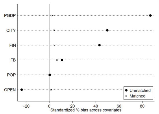 One potential concern regarding the study in this paper is that the selection of pilot areas for smart city construction by the central government may not be entirely random. To address the possible issue of sample self-selection in the benchmark regression and enhance sample comparability, this paper employs a combination of difference-in-differences (DID) and propensity score matching (PSM) to validate the reliability of its conclusions. Firstly, all control variables in the benchmark regression are included as covariates representing individual characteristics of each city, and a Probit model is utilized to conduct regression analysis and calculate propensity score values. The balance test results depicted in Figure 3 demonstrate that after propensity score matching, standardized deviations for all covariates are below 10%, indicating satisfactory matching effectiveness and fulfillment of balance assumptions. The regression outcomes presented in Column (1) of Table 4 reveal that even with these adjustments, the estimated coefficient for the core explanatory variable “Smart” remains significantly negative.