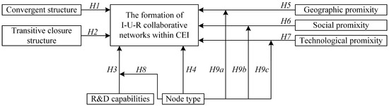 To address these gaps, this paper (1) proposes twelve hypotheses based on the complex network theory, proximity theory and collaborative innovation theory, (2) employs the exponential random graph model (ERGM) to analyze the dynamic influence of network structural attributes (e.g., convergent structure), node attributes (e.g., R&D capabilities), and edge attributes (e.g., geographic proximity) on the formation of I-U-R collaborative networks in the CEI, and (3) explores the heterogeneous roles of node types—enterprises, universities, and research institutes—in shaping these networks across different stages. The overview of the theoretical model proposed in this study is depicted in Figure 1.