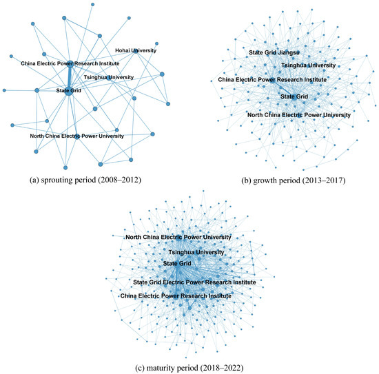 As Figure 2 illustrates, hubs, represented by State Grid, China Electric Power Research Institute and Tsinghua University, occupy the core position of the I-U-R collaborative networks, indicating the networks’ obvious core-periphery structure.