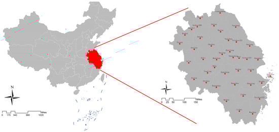 The Yangtze River Delta region, situated in the eastern coastal area of China, was classified as one of the world’s leading megacities by [37]. This research utilizes the “Outline of the Integrated Regional Development of the Yangtze River Delta” issued by China in 2019, to define the urban agglomeration of the Yangtze River Delta as comprising 13 prefecture-level cities in Jiangsu Province, 11 in Zhejiang Province, 16 in Anhui Province, and the municipality of Shanghai (Figure 1). As of 2023, the Yangtze River Delta region had achieved a total economic output exceeding CNY 30 trillion, ranking it second among global urban agglomerations. The resident population has reached 238 million, boasting a population density of over 660 individuals per square km, significantly surpassing the metropolitan scale proposed by [37], which stipulated a minimum of 25 million inhabitants and a density of 250 individuals per square km.