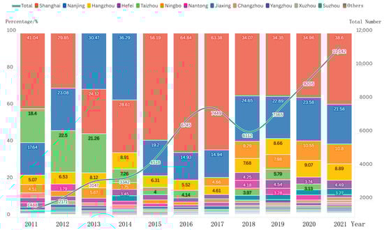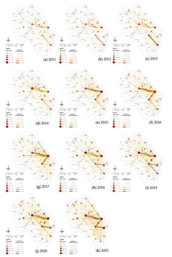 Figure 2 presents the variation in the number of co-invented patents for cities in the Yangtze River Delta from 2011 to 2021. The total number of co-patents shows an overall upward trend with minor fluctuations: it rose from 1488 in 2011 to 11,142 in 2021, with an average growth rate of approximately 27.5% and an overall growth rate of 648.8%. Specifically, from 2011 to 2014, the number gradually increased from 1488 to 3342, and then climbed to 7449 by 2017, during which the maximum growth rate was approximately 49.3%. Between 2017 and 2018, the number dropped to 6112, and from 2018 to 2021, it quickly rebounded to 11,142, with the maximum growth rate of about 21.1%. Combining Figure 2 and Figure 3, the following results can be obtained.