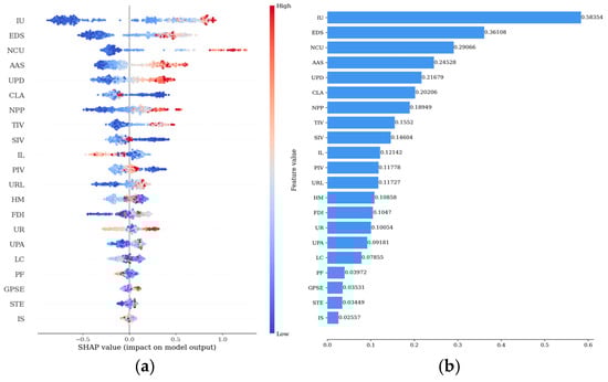 To more precisely assess the influence degrees of multidimensional factors, this research quantitatively ranked the contribution degrees of factors using the SHAP model. Figure 5 depicts the relative importance of the 21 factors to urban innovation cooperation. In Figure 5a, the horizontal axis represents the SHAP values. A positive value indicates that the factor has a positive impact on the result, and the larger the value, the greater the contribution of the factor, and vice versa. A color tending toward red suggests a relatively high value of the factor, while a color tending toward blue implies a relatively low value. The degree of dispersion of the points illustrates the variation in the factor’s influence across different samples, serving as an indicator for judging the stability of the factor’s contribution degree. For instance, the distribution of AAS is quite evident: the high-value parts are all greater than 0, and the low-value parts are all less than 0. This suggests that an increase in the average wage of urban employees leads to a sharp rise in the number of urban innovation cooperation cases. Conversely, when the average wage drops, the number of urban innovation cooperation cases will decrease significantly. This result also aligns with our subjective perception.