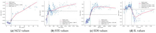 As shown in Figure 6, the Scientific and Technological dimension generally plays a positive promoting role in urban innovation cooperation. Among them, EDS, NCU, and STE all exhibit a significant positive promotion when exceeding a certain value, while IL undergoes repeated fluctuations and finally tends to remain stable. For NCU, when the number of universities is less than 11, it has a U-shaped negative impact. After reaching 11, NCU begins to show a positive linear promoting relationship. This indicates that when there are fewer universities, there may be limited knowledge resources and insufficient basic levels. As the number increases, the transformation of scientific research achievements and talent cultivation in universities play a positive promoting role in urban innovation cooperation [89]. As the value of EDS increases, the SHAP values generally show a trend of gradually rising from negative to positive and then stabilizing, roughly following a logarithmic function. The explanation is that when the number of enterprises is small, it may suggest to some extent that most enterprises in the region are at the two ends of the industrial chain, lacking in innovation. Only when the number of enterprises continues to grow can the industrial chain be completed, promoting the emergence of innovation cooperation. STE is roughly the same as EDS. The difference lies in that STE finally tends to grow at a constant rate, indicating that the role of government research expenditures will become limited after reaching a certain level [90]. The impact of the IL is relatively complex. When it is small initially, it has a negative impact. As it increases, it first rises to a positive peak, then drops to negative values, and finally tends to be 0. It shows an overall polynomial function relationship, which is consistent with the research of [91].