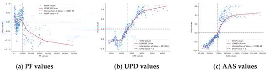 The Human Resource dimension shows an overall trend similar to a logarithmic function in relation to urban innovation cooperation (Figure 7). Both AAS and the UPD witness a gradual increase in SHAP values along with the growth of their respective numerical values, while the growth rate slows down. At the same time, when the value of both factors exceeds a certain threshold, they will change rapidly, which greatly improves the contribution to urban innovation cooperation. However, the passenger flow factor (PF) has a relatively low concentration degree, generally showing a transition from positive promotion to negative inhibition as the value increases. To explain this phenomenon, we can consider it from the perspective of brain drain. A large number of personnel flows, to some extent, indicates a severe brain drain, which in turn leads to a decline in urban innovation cooperation [92,93].