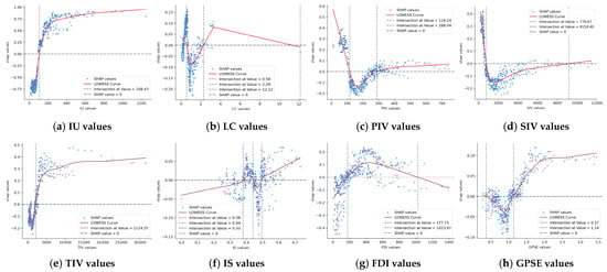 The impact of the Social and Economic dimension on urban innovation cooperation is complex and can be roughly divided into the following three categories (Figure 8). The first category consists of IU, TIV, and IS. As the values increase, the overall effect shifts from negative to positive and continues to grow. The second category shows an inverted-U quadratic function relationship, which is presented by GPSE, PIV, SIV, and FDI. Finally, it is worth mentioning LC. Based on the degree of scatter point aggregation, its trend is supposed to be similar to that of the second category, showing an inverted-U quadratic function relationship of decreasing first and then increasing. However, due to the limited sample size, its fitting curve eventually turns negative as the value increases. Based on relevant literature, this sample is considered incidental [94,95]. Therefore, it is determined that the LC factor should have a rapidly growing positive effect after the per capita number of books exceeds 2.29.