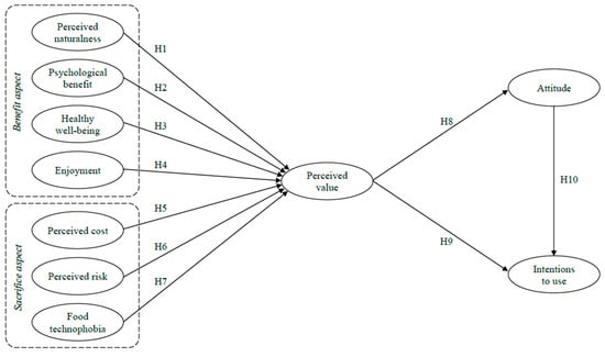 The concept of perceived risk refers to the degree of the consumer concern that products or services may not meet their expected benefits [49,50,51]. Consumers tend to worry about potential risks when new technology is introduced because they have no experience with the new technology [52,53,54]. This means that perceived risk is a non-monetary hindering component in regard to forming perceived value, whereas perceived cost is a monetary component. Investigating perceived risks in the context of new technology-based products and services is therefore highly crucial. For instance, Kim et al. [28] investigated the perceived risk of mobile accommodation reservation apps, proving that perceived risk had a negative effect on perceived value. Vishwakarma et al. [31] also proved that perceived risk is a hindering factor in regard to forming perceived value in the context of virtual reality-based tourism services. In the food technology context, Klerck and Sweeney [52] emphasized the significant negative role of perceived risk in forming consumer adoption in the GM food context. More recently, Sheng et al. [54] found that perceived risks play a negative role in consumers’ cultured meat adoption. That is, the perception of potential risks of new technologies hinders consumer value evaluation. Thus, the present study postulates the following hypothesis: