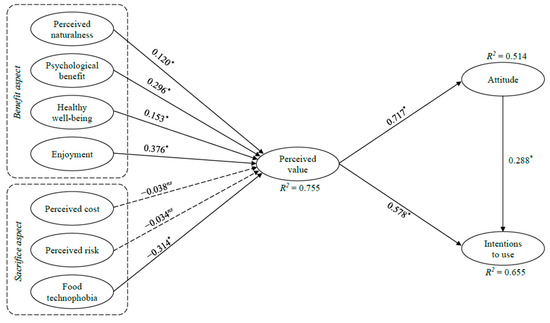 First, enjoyment is the strongest factor among the benefit aspects in shaping perceived value. This result aligns with the original VAM and previous studies applying VAM [12,31,32,47]. Second, perceived psychological benefit also plays a robust role in forming perceived value, supporting the findings of previous studies, such as those on eco-friendly broadcasting [35] and drone delivery [43]. Third, healthy well-being positively affects perceived value. Badu-Baiden et al. [33] and Kim et al. [46] examined the significant role of healthy well-being in forming customer perception, and the results of the current study are consistent with their findings. Fourth, perceived naturalness increases perceived value. Govaerts and Olsen [34] and Tenbült et al. [40] examined the essential role of perceived naturalness in forming consumer acceptance perception, and the results of the current study are consistent with their findings. Fifth, only food technophobia negatively affects perceived value among the sacrifice aspects. This supports the findings of previous studies highlighting the role of food technophobia as an acceptance barrier [60,61]. Finally, all links in the value–attitude–behavior hierarchy are also supported. This result aligns with the original VAB and previous works applying VAB [13,67,68,69,70].