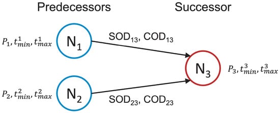 Example of a three-node developmental dependency network (from []). N: node; SOD: Strength of Dependency; COD: Criticality of Dependency; P: punctuality; : minimum independent development time; : maximum independent development time.