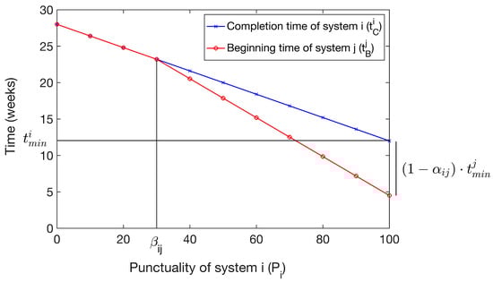 Completion time of system i and beginning time of system j as a function of the parameters of the developmental dependency between the two systems (, ). The red line shows how, due to the partial dependency modeled in SDDA, the successor system j can start its development before the predecessor system i is complete. The vertical gap between the red line (beginning time of system j) and the blue line (completion time of system i) is the lead time. This decreases with the decreasing punctuality of i until the critical threshold is reached, and the lead time decreases to zero.