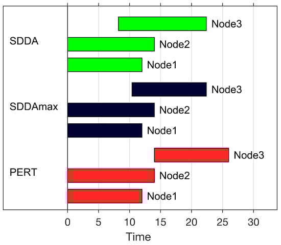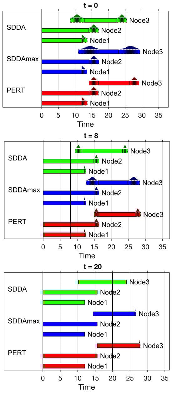 Figure 4 shows a Gantt chart [] for the simple network from Figure 2, comparing results from SDDA, the conservative formulation SDDAmax, and traditional PERT when all nodes have a punctuality equal to 100.