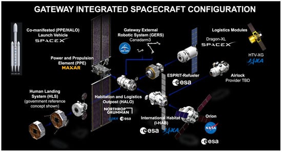 - Lehnhardt, E.; Travis, T.; Connell, D. The Gateway Program as Part of NASA’s Plans for Human Exploration Beyond Low Earth Orbit. In Proceedings of the 2024 IEEE Aerospace Conference, Big Sky, MT, USA, 2–9 March 2024; pp. 1–6. [Google Scholar]
