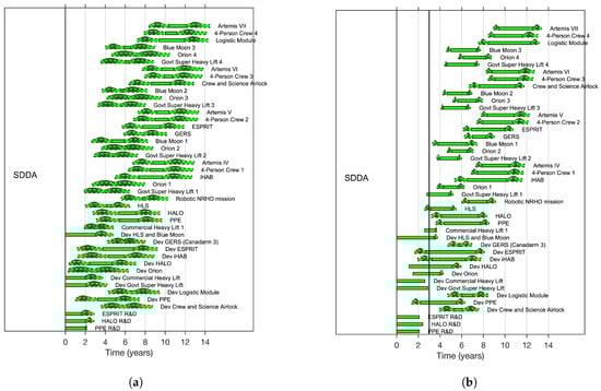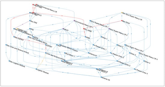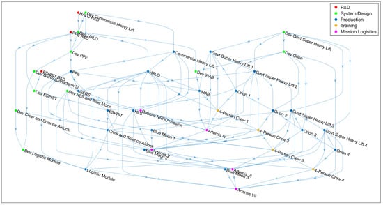 In order to present a full SDDA study, the problem includes tasks that have already been performed or that are currently under development. The resulting nodes in the SDDA development network include Research and Development (R&D) of new technologies, the design and production of systems, crew training for specific missions, and the logistics of various planned missions. Development dependencies are evaluated based on considerations from the literature: R&D and system design must occur prior to the correspondent system production; the production of systems, training of crews, and definition of missions follow the sequence established for the development of the Gateway.