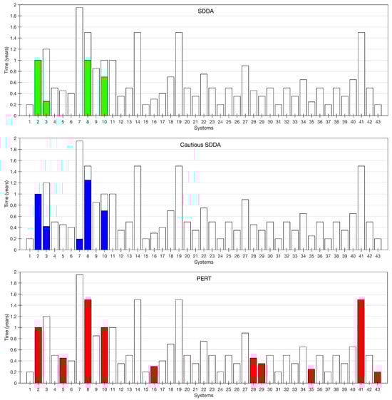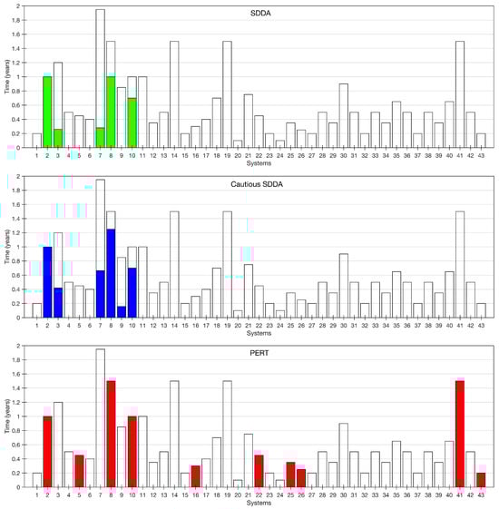 Figure 4 shows that, in PERT analysis, the third system (Node3), which is dependent on the first two (Node1 and Node2), must wait until its two predecessors are fully developed. SDDA and SDDAmax exhibit a lead time for the development of Node3. Due to the high strength and criticality of the dependency of node3 on Node2, this lead time is small. We can also notice how SDDAmax is more conservative than the basic SDDA model; therefore, the lead time is even smaller. SDDA and SDDAmax models result in the same completion time for the whole network (which is shorter than that of PERT, thanks to the partial dependencies). However, the earlier beginning time for the development of Node3 allows for better delay absorption if Node1 and Node2 exhibit delays.