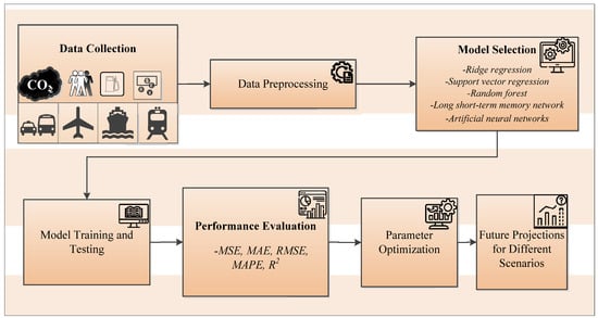 Based on the literature review, existing research on predicting transportation-related CO2 emissions has a number of limitations. Many models primarily focus on single-mode transportation analysis, often emphasizing road transport without considering the interactions between multiple transport modes such as rail, air, and marine transport. Furthermore, while machine learning and statistical models have been widely applied, few studies have integrated multiple advanced techniques to enhance prediction accuracy and interpretability. Finally, few researchers have addressed scenario-based future projections by incorporating possible future technological developments and policy changes. This study addresses these gaps through the integration of multiple advanced algorithms to enhance model adaptability, conducting a comprehensive multi-mode transportation analysis to better capture system dynamics and incorporating scenario-based future projections to improve predictive accuracy and policy relevance.